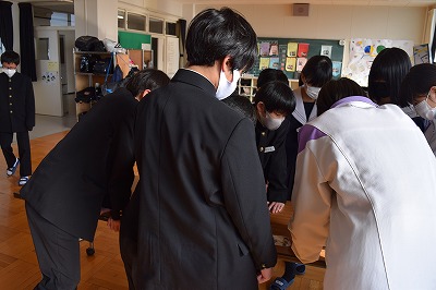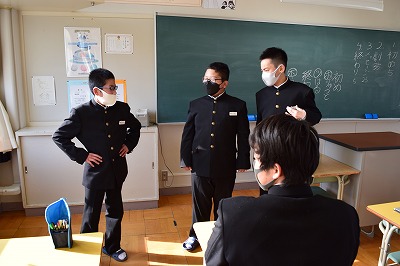 予餞会に向けて、何やらユニークなやりとりをしているクラスがありました。全体を指揮する生徒、忠実に役割を果たそうとこたえる仲間、クラスのチームワークもばっちりのようです。
