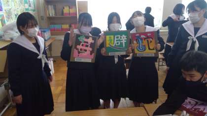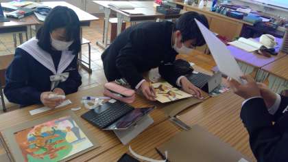 1年生の美術の授業は文字を使ったデザイン画を制作しています。個性豊かなアイデア、あっと驚くような素晴らしい作品、様々な工夫がされています。制作中はどの子も真剣そのもの、とてもいい顔をしています。