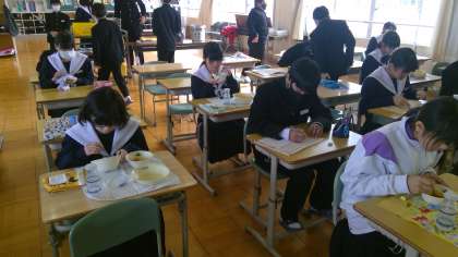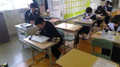 給食の時間に食べ終わった生徒は時間をうまく使って学習に取り組む生徒、タブレットを使って授業のふり返りを記入する生徒、それぞれです。時間を有効活用しています。