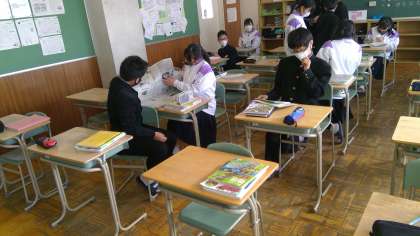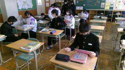 今週はテスト週間に入ります。休み時間にも学習に取り組む人、友達と勉強について話をする人も多くいるようです。1年生最後の定期テストにむけて、意識を高めていってほしいと思います。