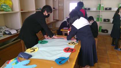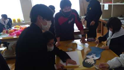 最後の仕上げも心をこめて一つひとつ作り上げていきます。担任の先生もまじえて本当にいい雰囲気で取り組んでいる5組の生徒たちでした。