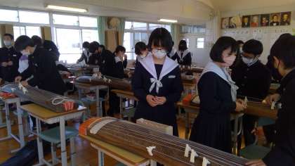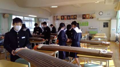 音楽の授業では、筝曲「六段の調」を鑑賞した後の体験に入りました。1時間目の学習は、「琴柱」を立てるところからです。一本一本の弦をぐっと引き伸ばし「硬い〜」と言いながら十三弦の音を作っていきました。次回からは、「さくらさくら」の演奏にもチャレンジしていきます。どんな演奏になるのか、とても楽しみです。