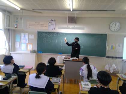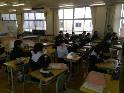 国語の授業で、「垂直線の線と水平の線を使って物事を表現しよう」という難しい課題に取り組む生徒たち、夢中になってクラスメイトに説明している姿がとても印象的でした。何やら多くのことが表現されているようですが、どうやら歴史に関係することのようです。