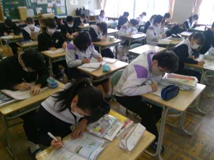 学年末テストを明日にひかえる1年生、この日ばかりはどの教科も復習や問題演習を行う授業が多かったようです。真剣な表情でみんな最後の追い込みに励んでいます。その頑張りを明日からの3日間で発揮できるといいですね。