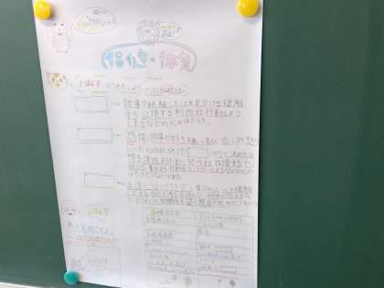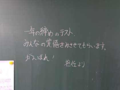 学年末テスト直前、1年5組の教室には係によって作られた保健体育のテスト対策の掲示物がはられていました。黒板には担任の先生からの熱いメッセージが書かれていました。クラスみんなで頑張っていこうという雰囲気が伝わる思いがしました。みんな頑張れ!