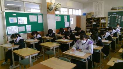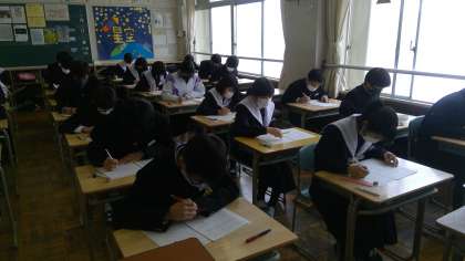 1年間の学習の成果を出すときです。落ち着いて最後まであきらめずに問題に向き合っています。窓の外は雪で真っ白です。