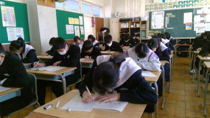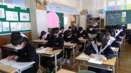 昨日とは打って変わって、あたたかな日差しが差し込む最終日になりました。今日1限目は家庭科、2限目は英語のテストです。リスニングにもしっかりと耳を傾けていました。