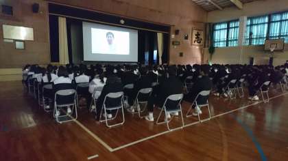 最後はこの日のために用意した3年間を振り替える動画を見ました。1年生や2年生の時の自分たちの姿をみんな懐かしがっていました。また、動画の最後にはこれまでお世話になった先生方からの卒業を祝うメッセージがあり、久しぶりに見る先生方の姿に、みんなうれしそうでした。