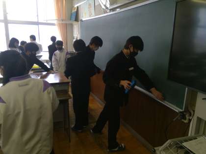 午後から卒業式のリハーサルがあるため、午前中の授業を終え、清掃なしでの下校する1年生。それでも給食を早めに食べ終え、教室のほこりや机の水拭きなど教室美化に取り組む生徒たちの姿がありました。黙々と清掃にむかう姿勢が素晴らしいなあと思いました。