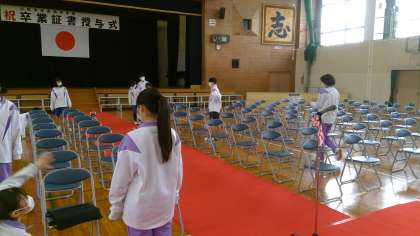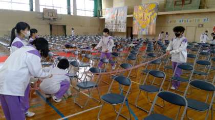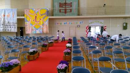 式場がどんどん形になってきました。タフロープを使って、丁寧に椅子を並べます。真剣になるほど、みんなの声が大きくなります。明日はきっといい卒業式が迎えられると思います。