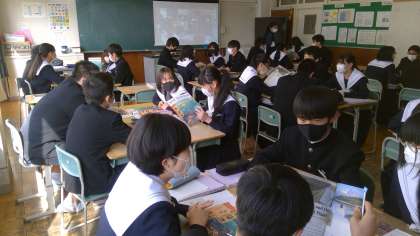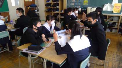 英語の授業の様子です。難しい単語をたくさん勉強していました。難しい単語もグループで楽しそうに関わりながら学習していました。
