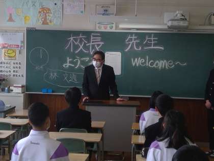 校長先生をお招きをしての帰りの短級、校長先生が教室に入った瞬間に拍手で歓迎しました。今日聞かせていただいたお話は校長先生の「学生時代の苦い思い出」「忘れられない生徒」「初恋の思い出」などたくさんの楽しいお話をしていただきました。1年1組の生徒たちは大喜びでした。最後に校長先生を囲んで記念写真を撮影しました。1組の子たちにとって心に残る思い出になりました。