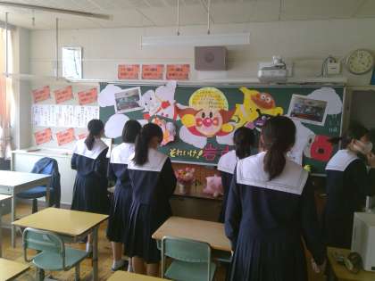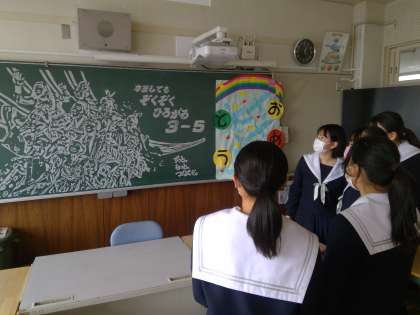 3年生の教室は卒業式の日のままです。1年生にクラスの仲間が一生懸命つくった教室の飾りつけを見てもらうため、また3年生にむけて先生方が心をこめて記した言葉や教室の様子を見て、中学校の卒業式というものを肌で感じてほしいと思い、今日までこのままにしてもらいました。1年生の生徒たちは教室の様子を見て驚いている子が多くいました。「こんなにすごいんだ。」と思わず声に出している子もいました。1年生にとってとてもいい時間となりました。