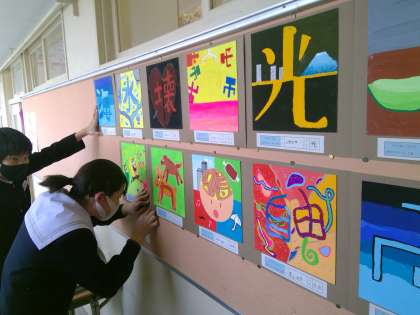 教室の廊下には美術の授業でつくったデザイン画を掲示しています。文字をかたどったデザイン画、個性的な素晴らしい作品がたくさんはりだされました。廊下を歩きながら作品鑑賞も楽しめるというものです。