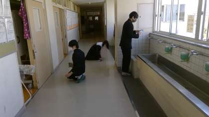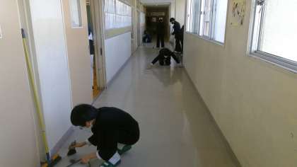 寒い廊下でも隅々まで水拭きを行っています。きれいな環境は自分たちで作ります。