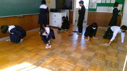 クラスのみんなと協力して床をきれいにしています。ドアのレールなど細かいところまで丁寧にやっていました。