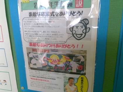 1年4組の教室の掲示物には、見慣れない学級通信が掲示されていました。これは3年4組担任の渡邊先生から卒業式の教室の飾りつけに対するお礼のメッセージが書かれた特別の学級通信でした。心に対しては心が返ってくる。渡邊先生の4組の生徒たちにむけた温かい気持ちのこもった通信を読み、4組の子どもたちはとても喜んでいました。渡邊先生ありがとうございました。