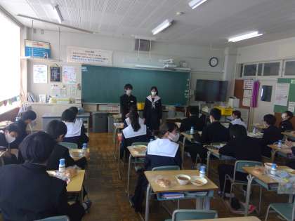 1年生は授業前の2分前着席や給食準備・片付けの時間をスムーズに行えるようにと各学級が目標をもって時間を意識した生活を過ごしています。入学したばかりの頃は、時間がかかった給食の配膳もすみやかに行えるにようになりました。この日は12時15分に授業が終わって12時23分には「いただきます。」1年4組の給食当番頑張りました。
