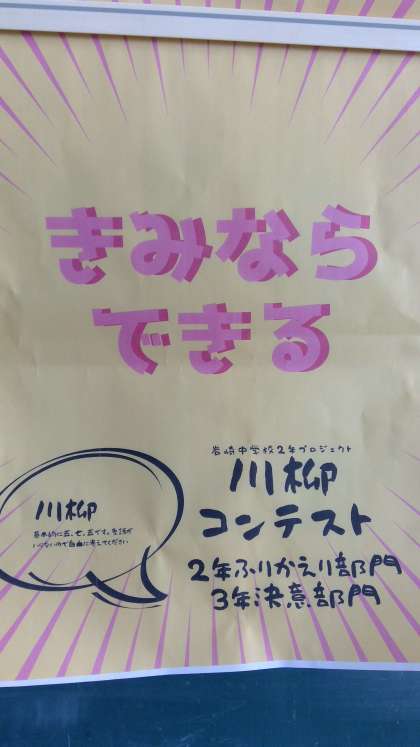 学年生徒会最後の企画は、「川柳コンテスト」です。こんな素敵なチラシが、教室に貼ってありました。「2年ふりかえり部門」と「3年決意部門」どちらも大切ですね。どんな句が出来るのか、とても楽しみです。