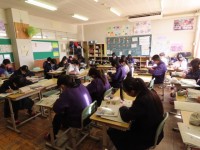 1年2組の学活は教室で何やらみんなで楽しんでいる様子でした。よく見てみると、様々な道具を使っての卓球大会でした。卓球部の顧問の先生らしいレクリでしたが、どの子もとても楽しそうに笑っている姿が印象的でした。