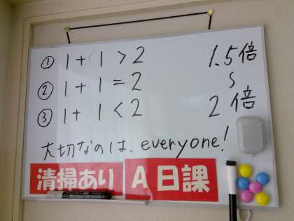 2年1組の教室のホワイトボードには担任の先生からこんなメッセージが書かれていました。1+1=2ではない!それ以上にもそれ以下にもなる可能性があります。学級みんなで協力し、いい方向にむかえるように頑張ってほしいと思います。