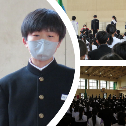 認証式で校長先生から、ドキドキしたり緊張する時は自分が成長できるチャンスなのだから、勇気を出して頑張ってみましょうと話がありました。その後、生徒会長が、よりよい学校にしていくために協力して頑張りましょうと全校に向けて抱負を述べました。