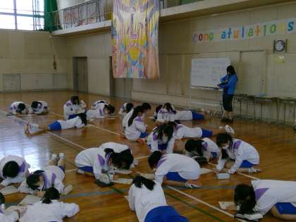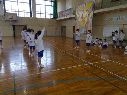 2年生の体育では集団行動を行っています。この日は集団行動発表会が行われました。指揮者の号令に従って全体がきびきびと行動していました。集団行動は体育の授業の基本です。整列や移動など、テキパキ行動できるようにこの発表会にむけて学んだことを今後の授業に生かしていってほしいと思います。