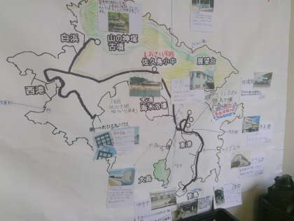 2年2組の教室の後ろに掲示された佐久島マップには、佐久島の見どころや学校、派出所、宿泊する宿などが写真つきでわかりやすく記されています。事前に佐久島の地理を学んで当日の島内散策に活用していってほしいものです。