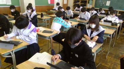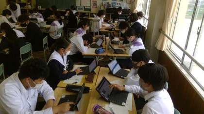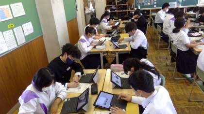 2日目に行く学級別研修地について、タブレット等を使って調べています。どんな体験活動をしてくるのでしょうか。とても楽しみですね。