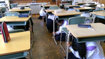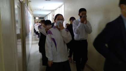 本日、3限の時間に避難訓練が行われました。クラスで「おさない はしらない しゃべらない もどらない」等の重要事項の確認をしていると、地震を知らせる校内放送が入りました。生徒たちはすぐに反応し、素早く机の下に隠れることができました。その後、理科室からの出火を想定し、速やかに運動場に避難する練習を行いました。