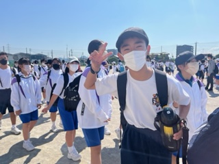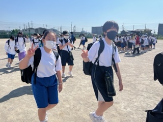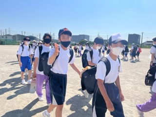 「いってきます!」お見送りに来てくださった先生方への元気な挨拶が響きます。学校から小牧山まで歩いて向かいます。気温が高いですが、頑張りましょう!
