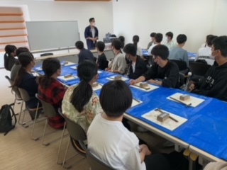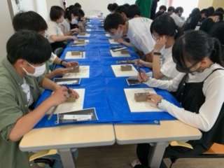 銀細工の説明を聞いたあと、銀の板を金槌でたたいて、模様をつけていきます。