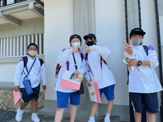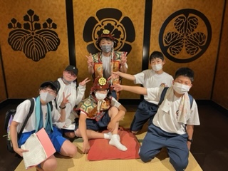 ただいま1組2組3組が班別研修中。こちらは、歴史館の様子です。館内に絶好のフォトスポットがありました。カッコ良く決まっていますね!