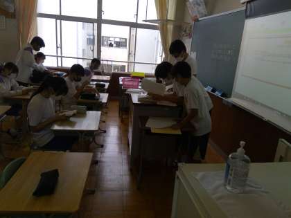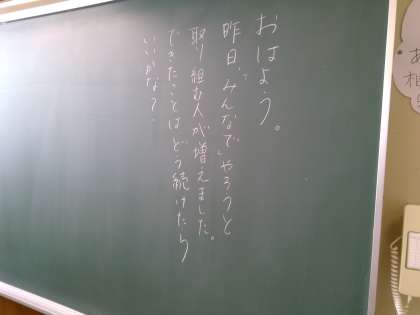 教室に入ると担任の先生からのメッセージが黒板には書かれているクラスが多くあります。また、登校後すぐに課題点検を始める係の生徒たち、朝からそれぞれが活動し、元気よく1日が始まっている様子でした。体育祭にむけて多忙な日々が続きますが、朝は落ち着いた雰囲気でどのクラスも過ごせているようです。