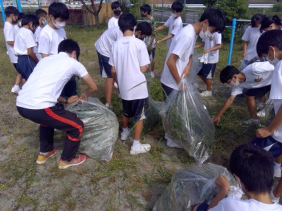 清掃時に生徒会企画「草抜き大作戦」が行われました。汗だくなりながらどの子も一生懸命取り組んでいる姿がとてもいいなあと感じられました。学年みんなでやり終えた後はとても爽快な気分になりますね。