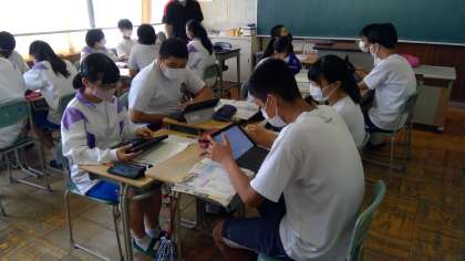 社会の授業でもグループ学習が行われていました。タブレットから情報を得る班、資料集から考えを深めていく班など、必要な情報を自分たちで考えて進めていきます。