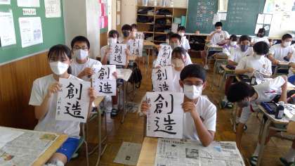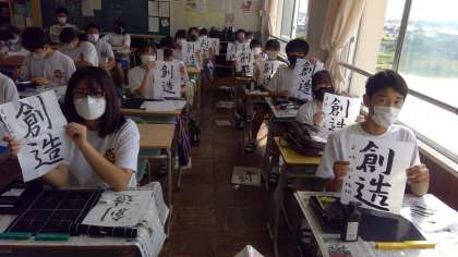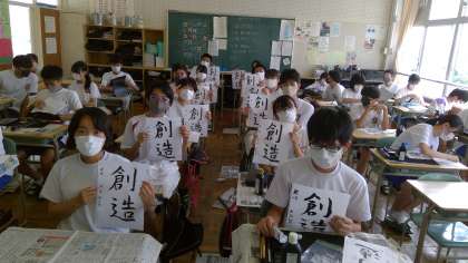 書写競技会に向けて集中して練習しました。授業の最後に、提出する作品を持って記念写真を撮りました。
