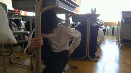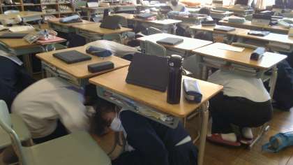 警報の放送と同時に、素早く机の下に身を隠す姿が見られました。机の脚もしっかりと押さえることができています。災害はいついかなる時に発生するかわかりません。日頃から自分の身は自分で守るという意識を持っておきましょう。