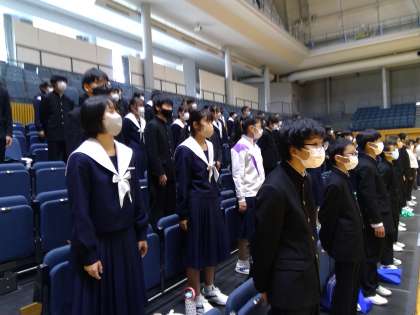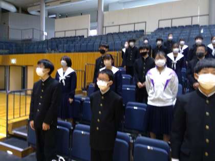 文化祭の開会式では、マスクをしたまま座席をあけて、全校生徒ではじめて校歌を歌いました。これまで練習したことがない校歌はなかなか歌えていない様子でしたが、それでも全校生徒がそろって歌う姿はやはりいいものです。