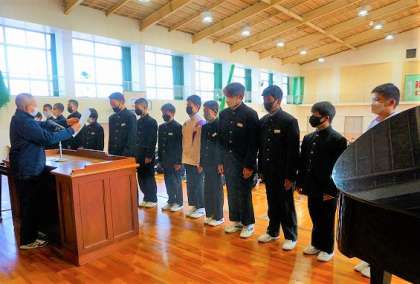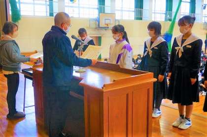 始業式に先立って行われた表彰披露では、1年生からも多くの生徒が表彰を受けました。表彰されるにふさわしい姿勢で自分の番を待ち、堂々とした態度で舞台に上がることができていました。