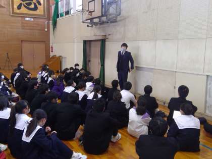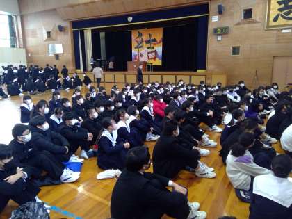3学期の始業式の終わりに、学年みんなで集まり、学年生徒会担当からの話を聞きました。年末に一生懸命取り組めた大掃除、一生懸命掃除に取り組める学年の良さを今日も発揮してほしいというお話でした。頷きながら真剣に話をうけとめて聴いている生徒たちでした。