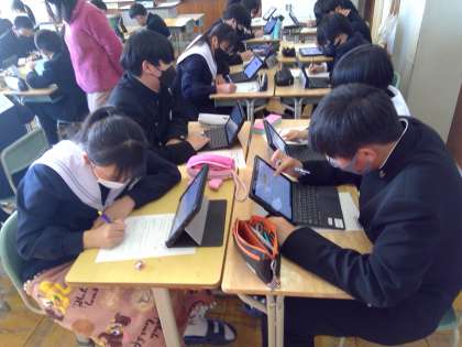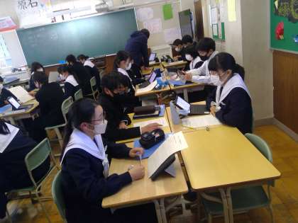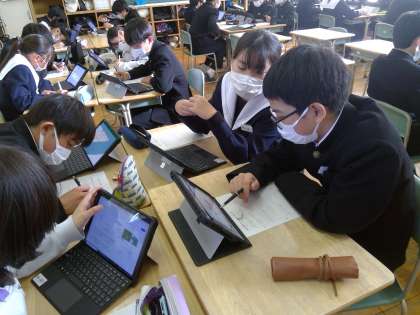 2年生はSDGsの学習として、SDGs17の目標のうち関心が高い項目をそれぞれが3つ調べ、それらの内容について学級で学び合いました。世界の現状を知り、多くの問題や様々な環境に置かれている人たち、同世代の子どもたちがいることに驚いている様子の生徒たちでした。