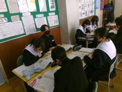 社会の授業では東北地方について学んでいます。この日の授業は、たくさんの資料から子も地域の特徴をつかもうという内容でした。資料を見てわかったこと、疑問点をグループで考え合い、語り合う姿がとても意欲的でいいなあと感じられました。