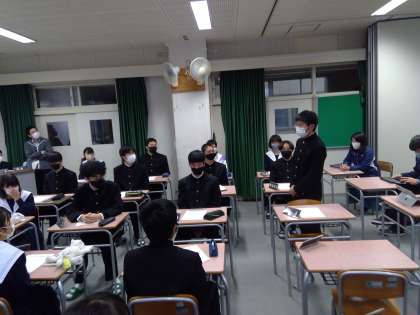 3学期最初の評議会が行われました。この日の評議会は3年生からの退任のあいさつを聞きました。一言一言に重みが感じられました。想いのこもった3年生の言葉、そしてその語る姿を1・2年生は目に焼きつけてほしいと思います。真剣な眼差しで話を聴きいる姿がとても印象的でした。