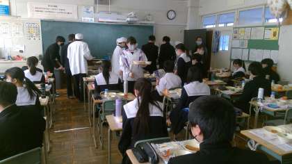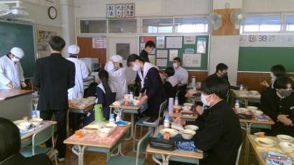 給食当番も係も協力して配膳しています。今日のメニューはきしめんでした。