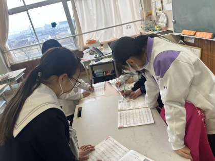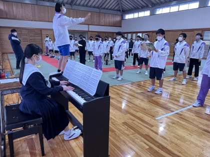 1年生は、合唱の練習をしているようです。本日の練習は、女子が教室、男子が武道場に分かれて行われました。曲の強弱やリズムを楽譜で確認したり、目標を立てて練習にとり組んだりする姿が見られました。男子は初めて全体で声を合わせましたが、まだまだ緊張している様子でした。学年全体できれいな三部合唱を完成させたいですね。