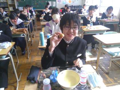 今日の給食は「愛知を食べる」愛知県で作られた食材を中心とした献立でした。2年生の生徒たちがとく喜んで食べていたのが「八丁味噌饅頭」でした。愛知県岡崎市の八丁味噌を使ったデザート!これまで出たことがない献立に大喜びの生徒たちでした。美味しくいただきました。