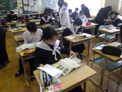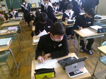 給食を食べ終えてほっと一息、そんな時間でも学習に取り組んでいる生徒の姿が目立つ今日この頃です。学年末テストに向けて、日々学習への意欲は高まっているようです。