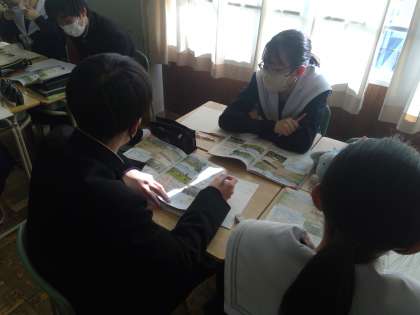日本の食料基地と呼ばれる北海道、北海道の農産物の生産が豊富なのにはどんな理由が考えられるか。グループで探究課題について資料を調べ、話し合い、学びを深めました。