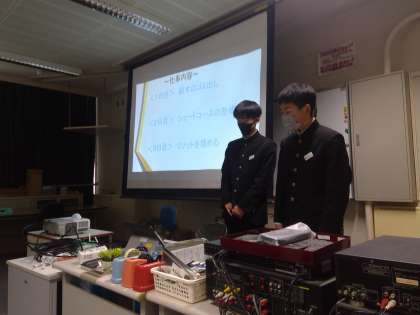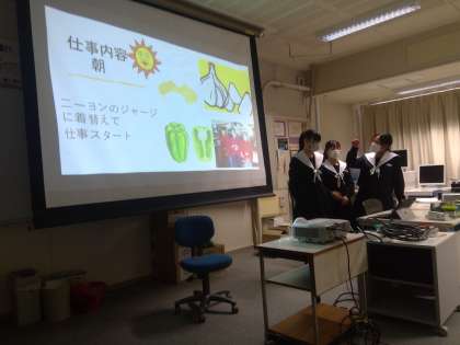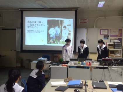先月行われた職業人体験学習をふり返り、プレゼン発表会がありました。3日間の体験で学んだこと、苦労したこと、心に残った言葉などを事業所ごとに発表しました。中には3日間の体験についてクイズを出し、聞いている人たちに関心をもってもらえるように工夫している人もいました。